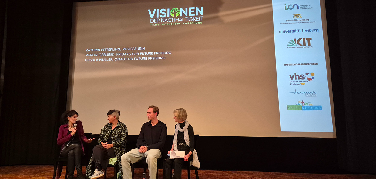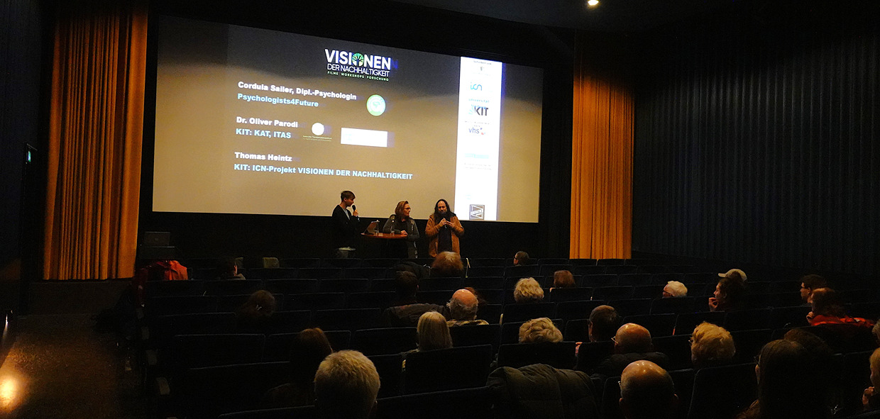 Gesprächspartner für die Diskussion nach dem Film waren Cordula Sailer (Psychologists4Future) und Dr. Oliver Parodi (KIT). Moderiert wurde die Veranstaltung von Thomas Heintz (KIT) aus dem "Visionen der Nachhaltigkeit"-Forschungsteam.