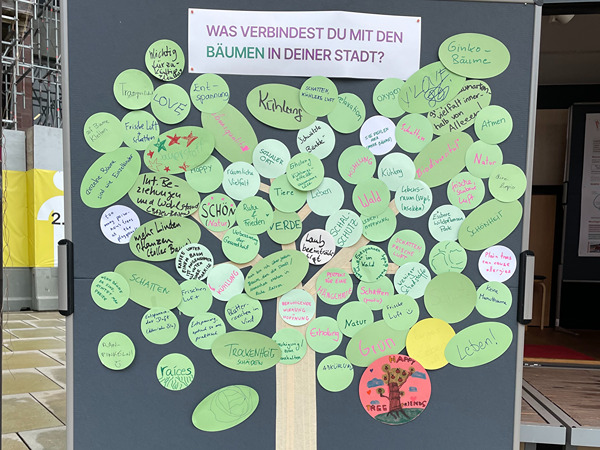 Ein zentrales Element war die Mitmachaktion, bei der Teilnehmende einen symbolischen Baum gestalteten. Auf bunten Kärtchen hielten sie persönliche Gedanken fest – etwa, warum Bäume für sie wichtig sind oder welche Erinnerungen und Wünsche sie mit Stadtgrün verbinden. Diese Kärtchen wurden zu den „Blättern“ des Baumes und machten die vielfältige Bedeutung urbaner Bäume für die Gesellschaft sichtbar.