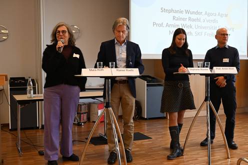 Nach der Ergebniszusammenfassung durch Prof. Dr. Kora Kristof, Vizepräsidentin Digitalisierung und Nachhaltigkeit des KIT, und Prof. Dr. Melanie Arndt, Prorektorin für Internationalisierung und Nachhaltigkeit der Universität Freiburg, fand ein Apéro mit offenem Match-Making zwischen Wissenschaft und Gesellschaft statt.